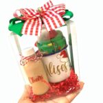 Set con vaso térmico, mini ponche, galletas navideñas y esfera navideña personalizada.