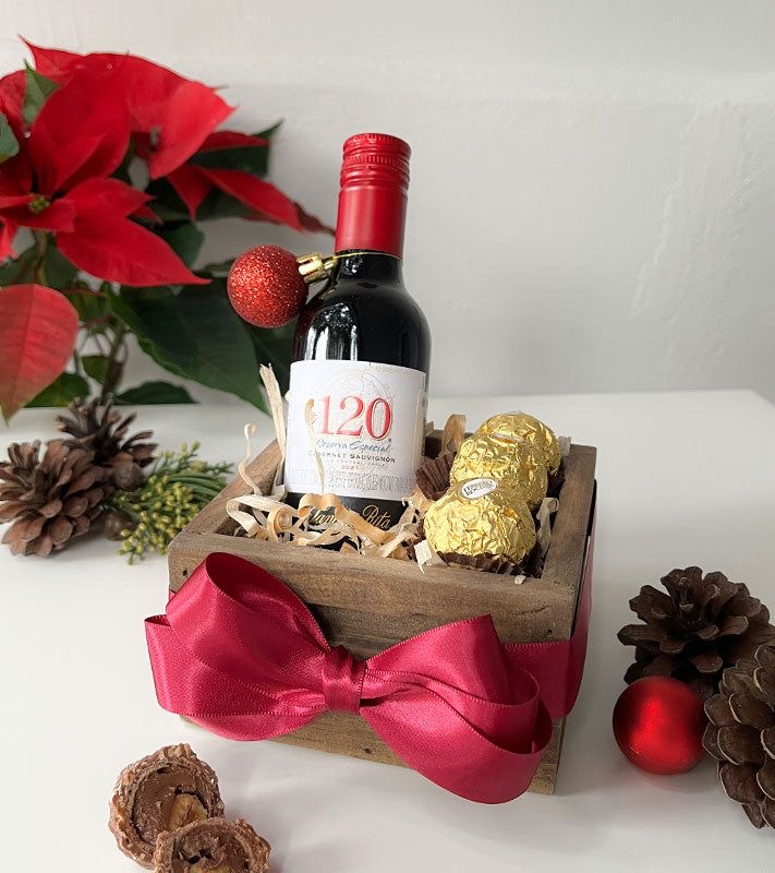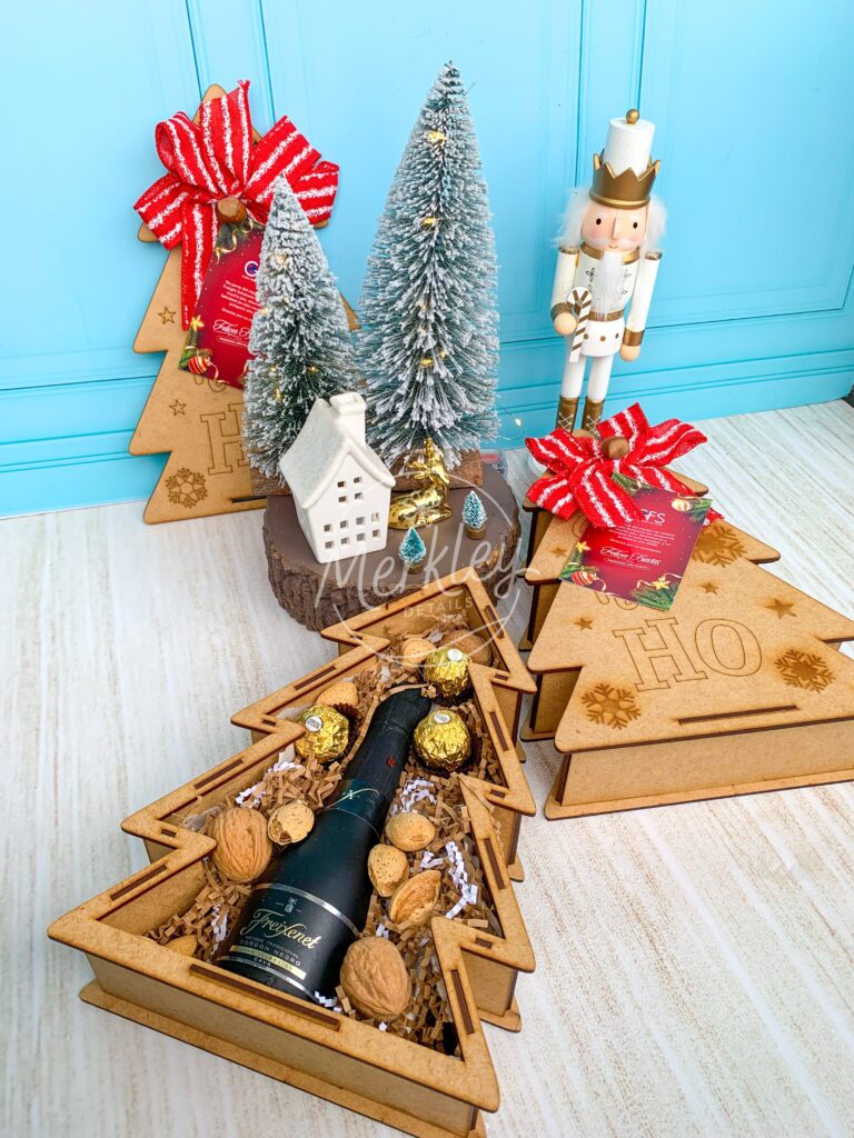 Cajita en forma de árbol con mini espumoso, bombones Ferrero Rocher y frutos secos.
