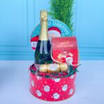 Cajita en forma de árbol con mini espumoso, bombones Ferrero Rocher y frutos secos.