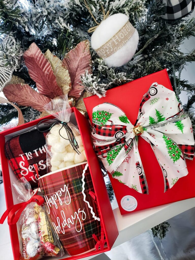 Taza navideña, set de medias, chocolate instantáneo y chocolates en caja decorada.