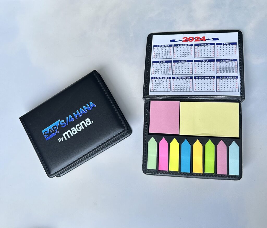 Post-it con calendario y portada personalizada en DTF UV, en caja tipo cuero.