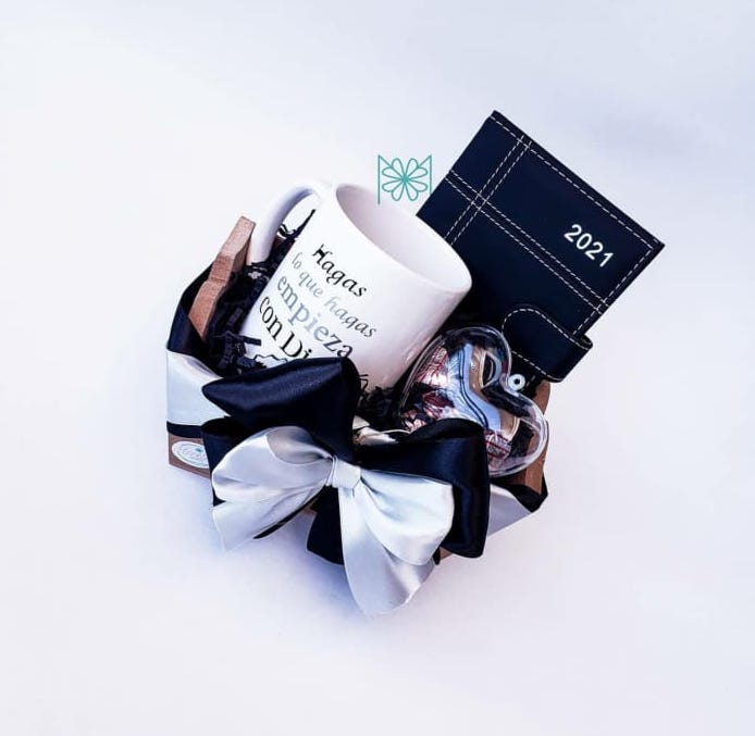 Cesta de madera libreta de apuntes, taza personalizada en vinil adhesivo y cajita con kisses.