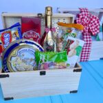Baúl con JP Chenet dorada, dulces, galletas danesas, marshmallows, Chivas 12 años, turrón y coquitos.