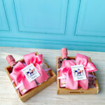 Cesta de madera mini JP Chennet, bath bombs, vaso corto de vino y pulsera o llavero.