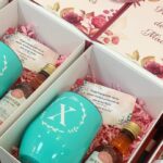 Caja madera mini espumoso o vino, copa, vela aromática y jabón orgánico floral.