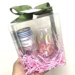 Caja madera mini espumoso o vino, copa, vela aromática y jabón orgánico floral.