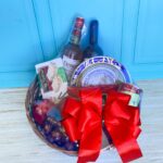 Canasta, ponche, vino Loma Negra y espumoso, manzanas, uvas, panettone, turrón, marshmallows y aceitunas rellenas.