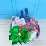 Canasta, ponche, vino Loma Negra y espumoso, manzanas, uvas, panettone, turrón, marshmallows y aceitunas rellenas.