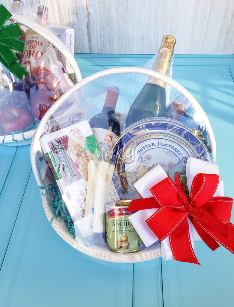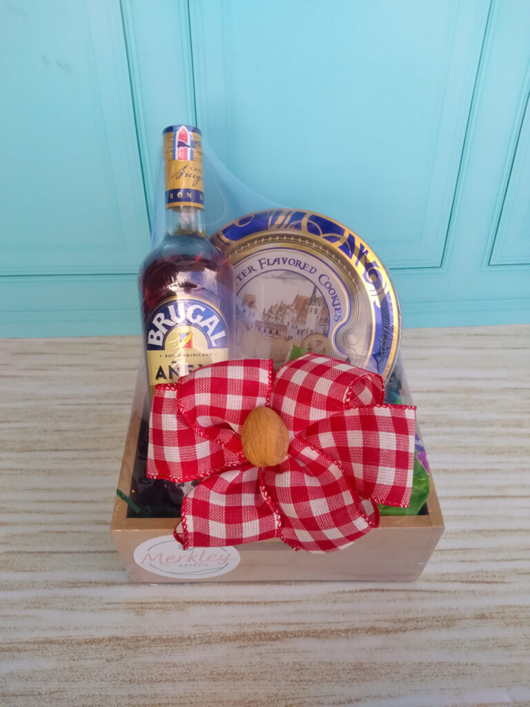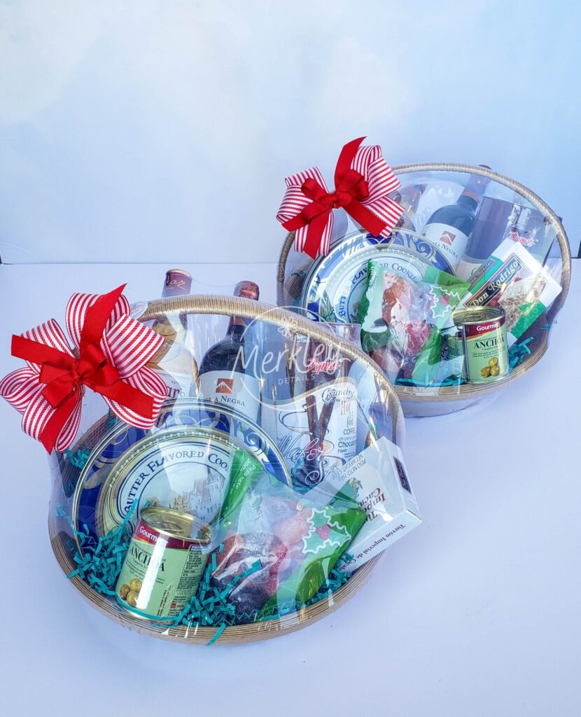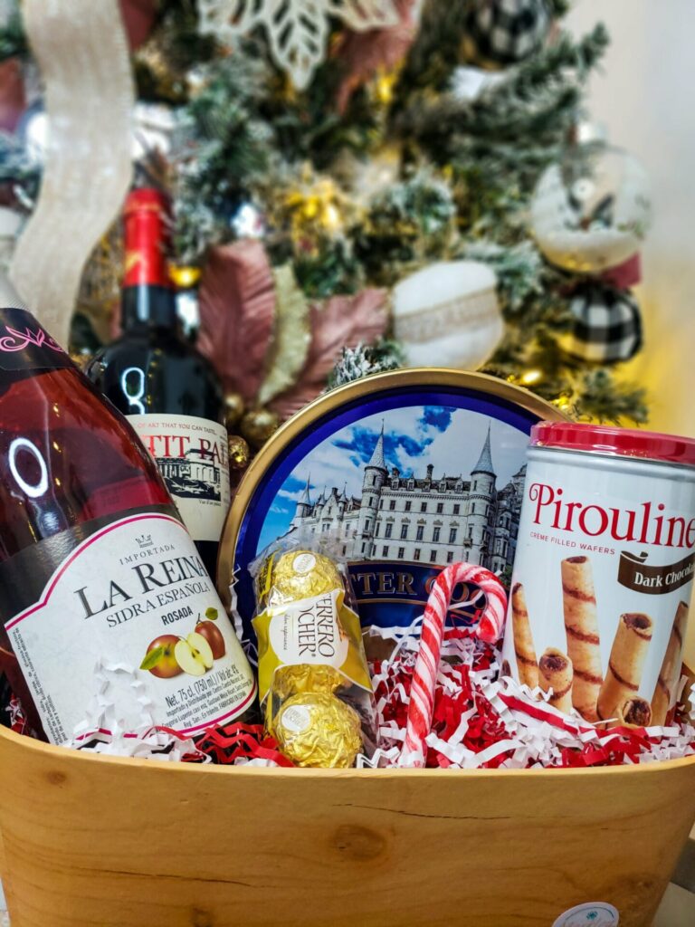 Dewar’s, vino tinto Loma Negra, galletas danesas, aceitunas, turrón, dulces navideños, wafer rolls y canasta.