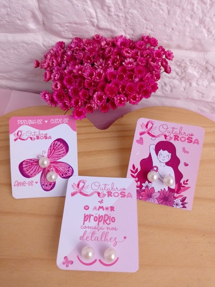 Aretes sencillos en base personalizada con temática del cáncer de mama.