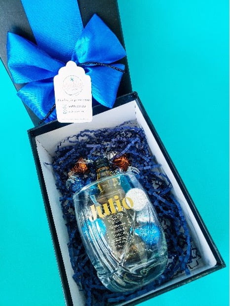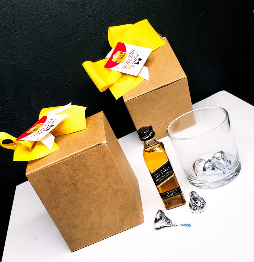 Whisky Dewar’s, manzanas, uvas, panettone, turrón, marshmallows, bombones Ferrero Rocher, frutos secos y canasta.