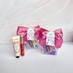 Cosmetiquera, crema de manos, espejo de cartera, pintalabios y sales de baño.