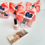 Cosmetiquera, crema de manos, espejo de cartera, pintalabios y sales de baño.
