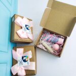 Cajita transparente con velita, scrub corporal, sales de baño y jabón floral.