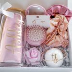 Vaso de cristal, scrunchie, bath bombs, cepillo de cartera y jabón floral.