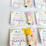Cajita transparente con velita, scrub corporal, sales de baño y jabón floral.