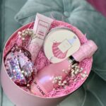 Vaso de cristal, scrunchie de gomita, aretes en base, jabón floral y joyero de viaje personalizado.