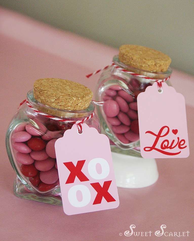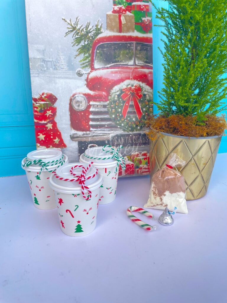 Vasos decorativos con chocolate instantáneo en polvo con Kisses y dulce.