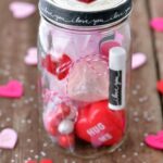 Frasco acrílico en forma de corazón personalizado, relleno con un bombón y manita limpia.