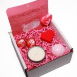 Jarra rellena con artículos mini spa decorados en tonos rojo y rosa.