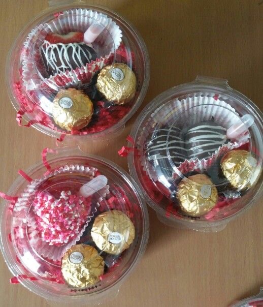 Vaso con dos bombones Ferrero Rocher y un brownie decorado.