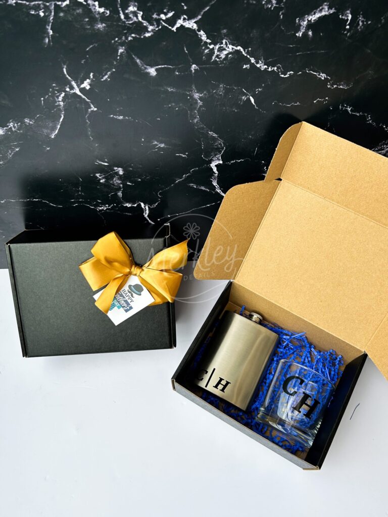 Vaso roca personalizado, mini whisky, llavero sencillo en madera y pañito del bolsillo.