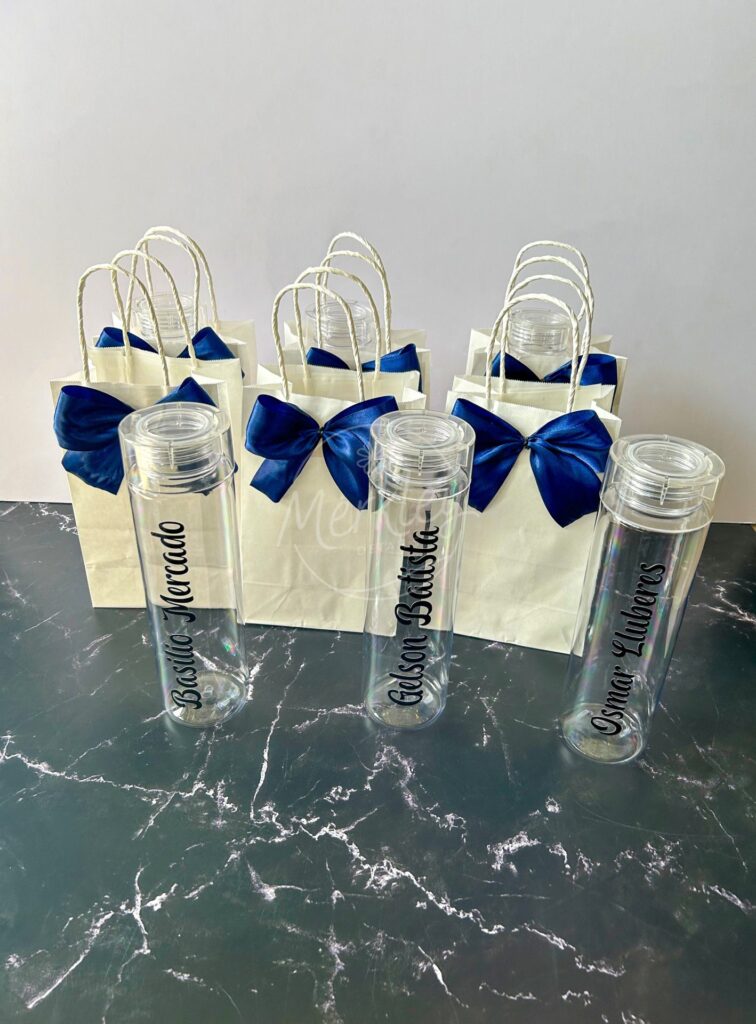 Set de vaso térmico personalizado, mini whisky, bolsa de frutos secos y bolsas de kisses.
