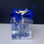Caja transparente con mini vino, mini espumoso y vaso transparente decorado.
