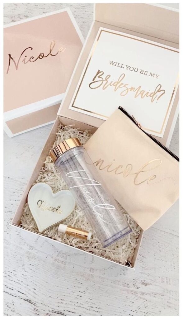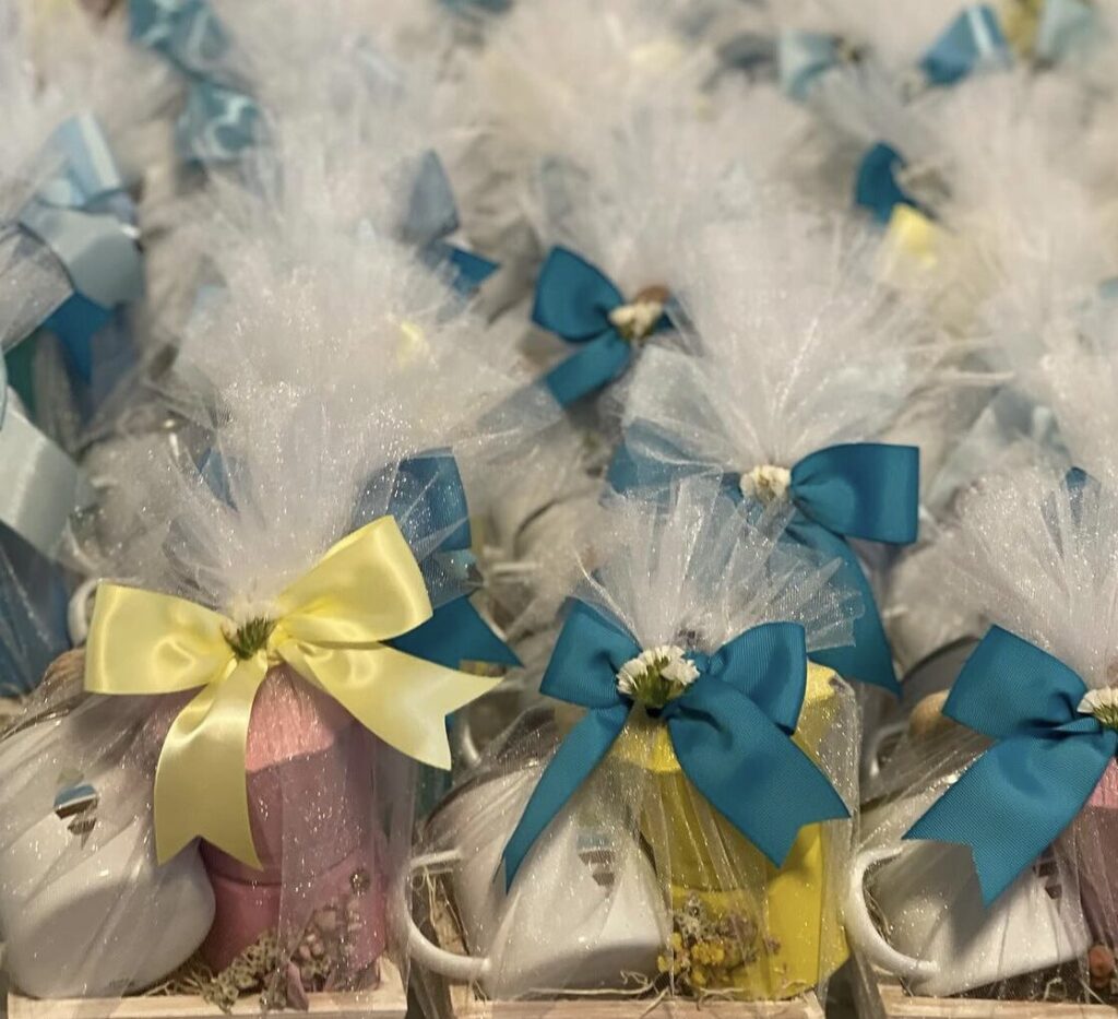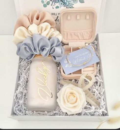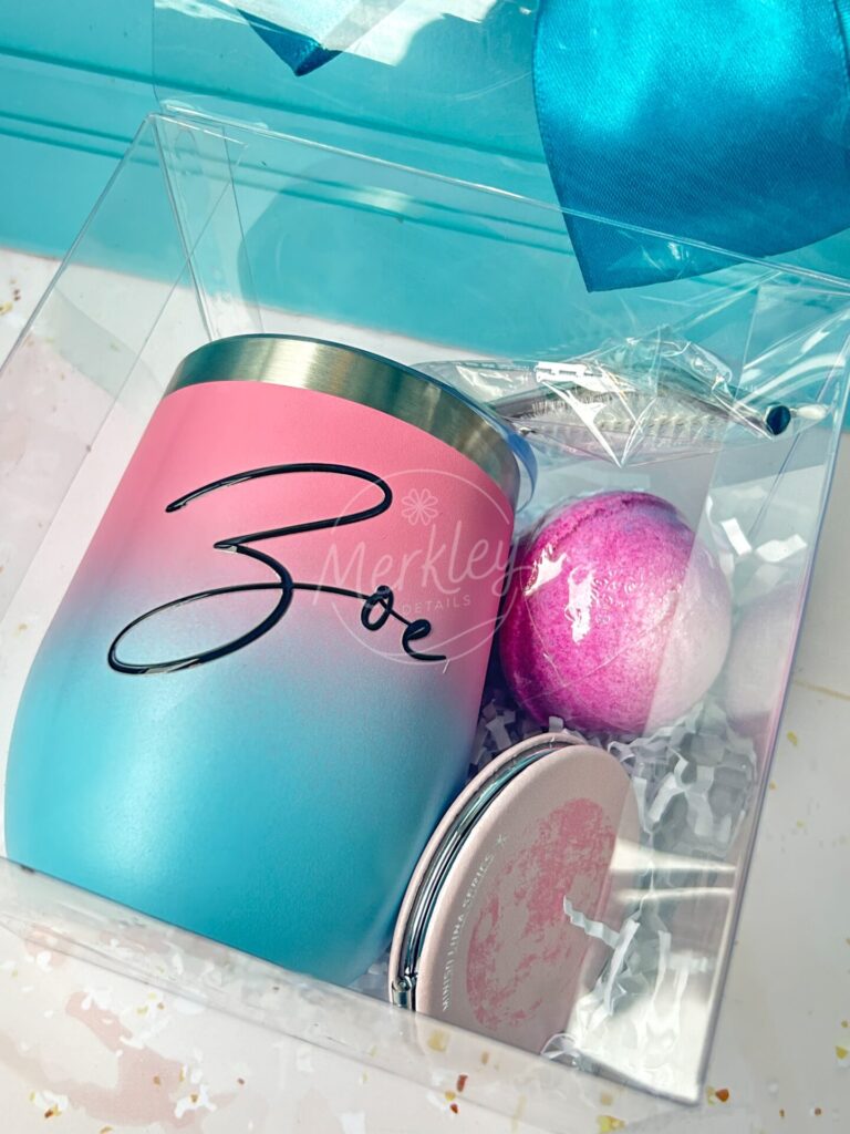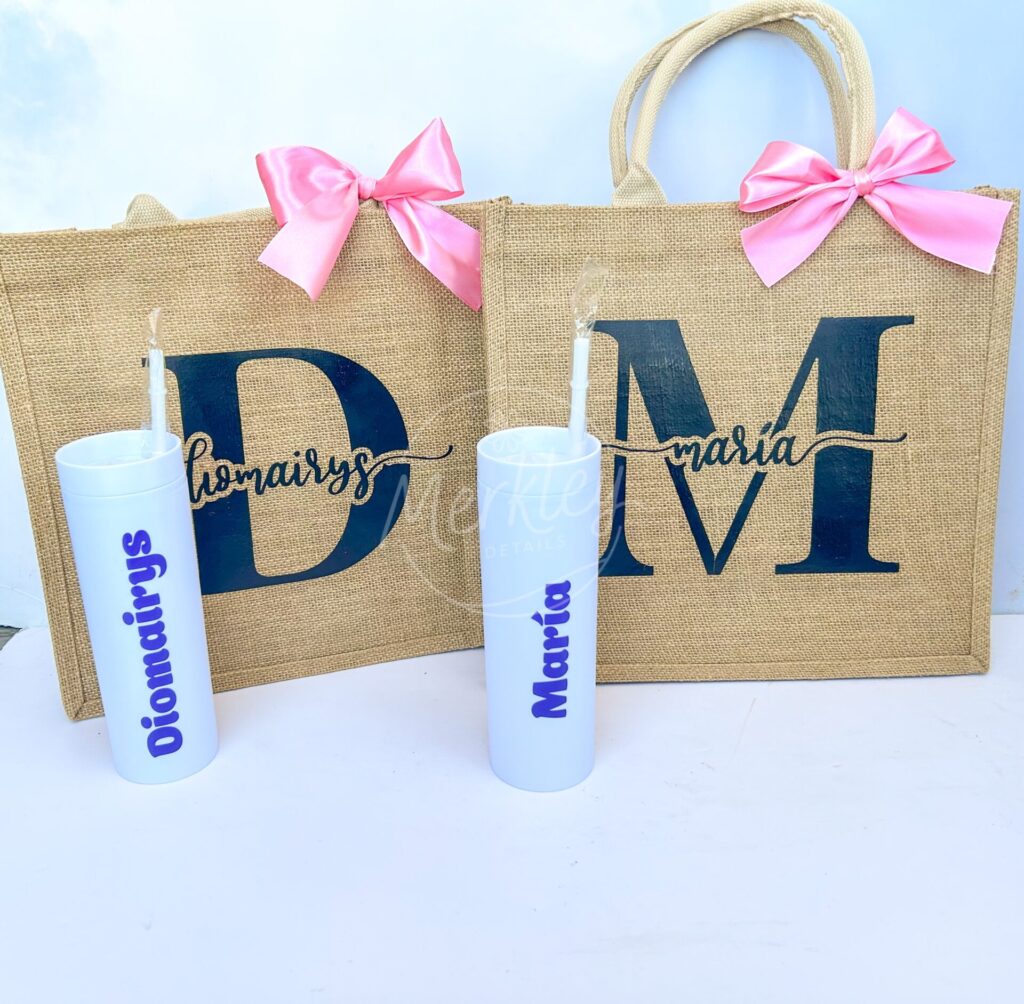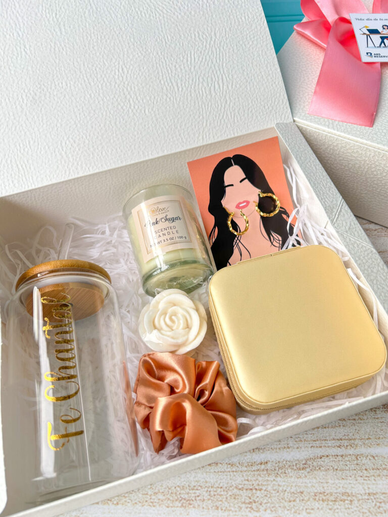 Vaso personalizado, set de scrunchie, flor artificial o jabón floral y joyerito de viaje en caja...