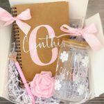Vaso personalizado, set de scrunchie, flor artificial o jabón floral y joyerito de viaje en caja...