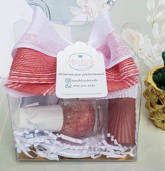 Cajita transparente con velita, scrub corporal, sales de baño y jabón floral.