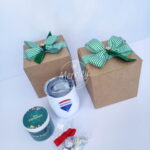 Caja de cartón con scrub corporal, bolsa de Kisses y vaso térmico personalizado en vinilo.