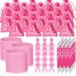 Set de pulsera de silicona, lapicero de metal y lazo de cáncer en cinta.