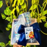 Set de vaso térmico personalizado, mini whisky, bolsa de frutos secos y bolsas de kisses.