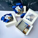 Set de vaso térmico personalizado, mini whisky, bolsa de frutos secos y bolsas de kisses.