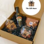 Baileys, bolsa de frutos secos, taza o jarra y chocolate decorado.