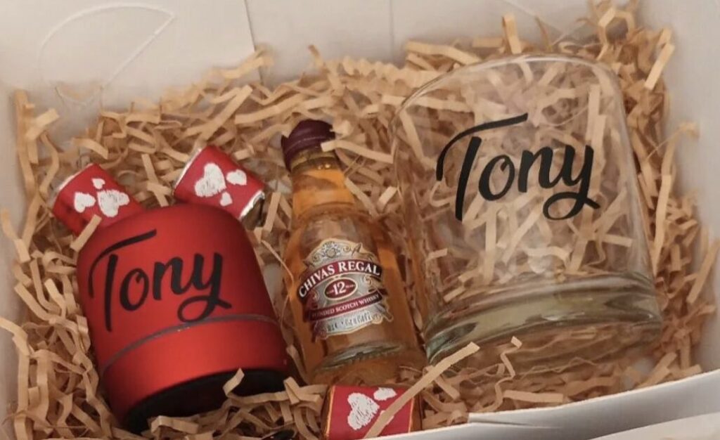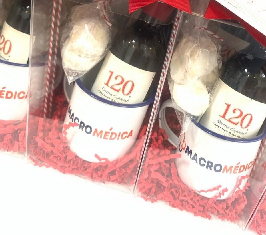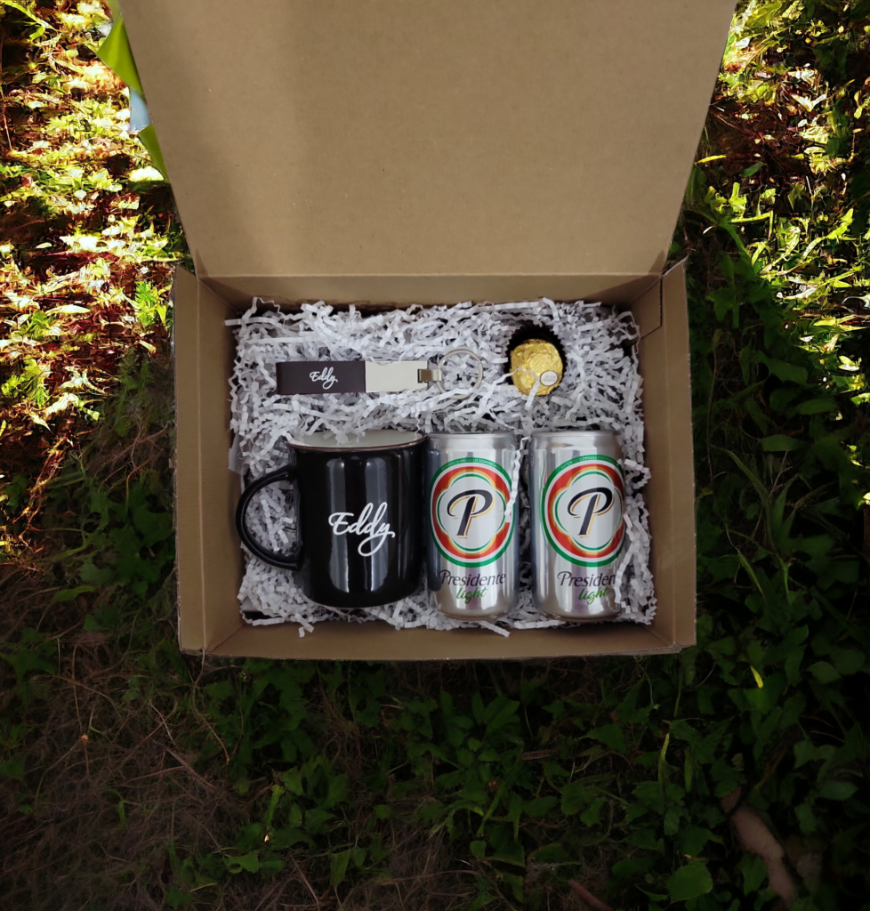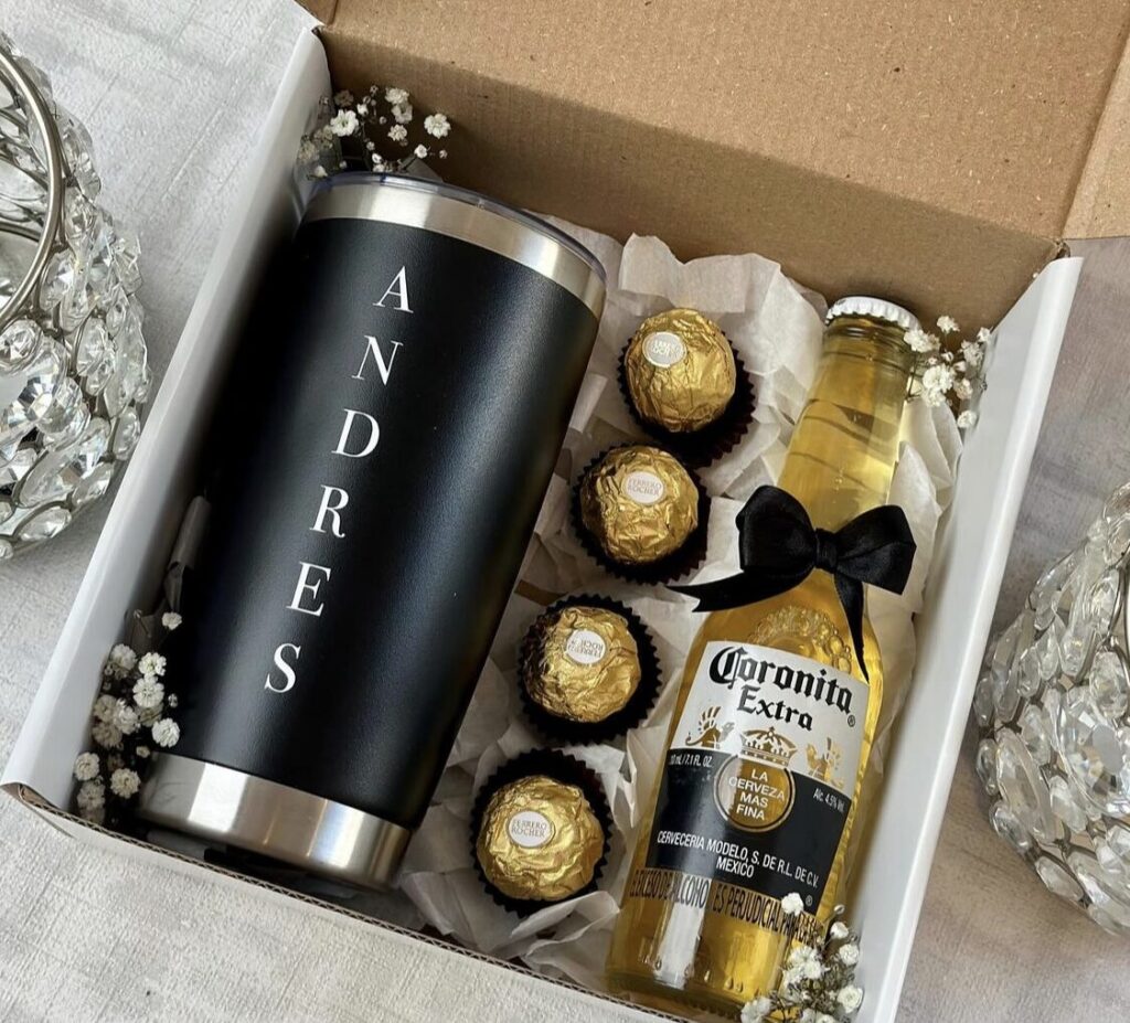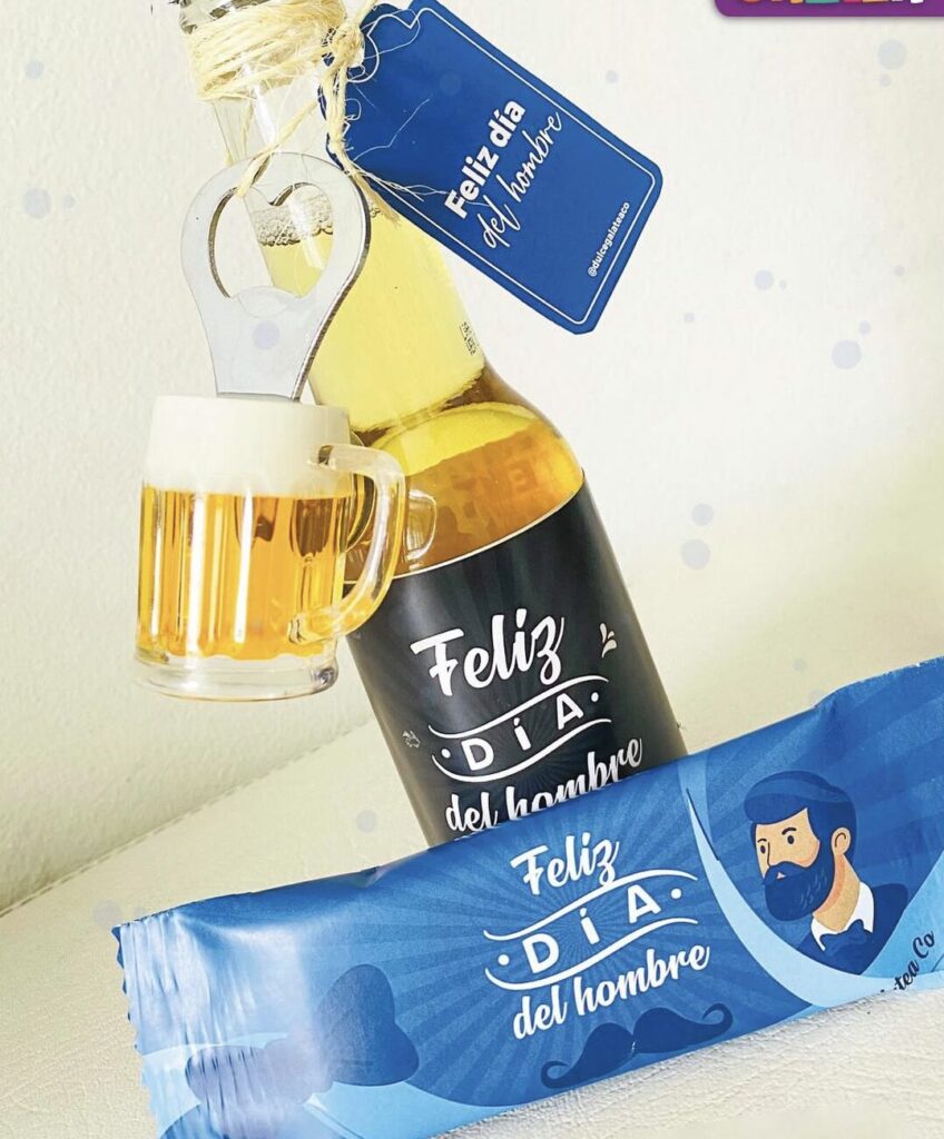 Taza, cervezas de latas, llavero de madera, frasco de frutos secos y jabón orgánico masculino.