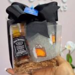 Caja transparente con mini vino, mini espumoso y vaso transparente decorado.
