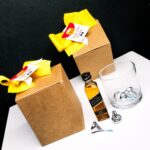 Caja transparente con mini vino, mini espumoso y vaso transparente decorado.