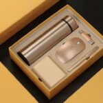 Frasco de frutos secos, lapiceros en base personalizada y vaso térmico en acero inoxidable.