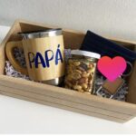Taza personalizada, medias, portatarjeta y frasco de frutos secos en cesta de madera.