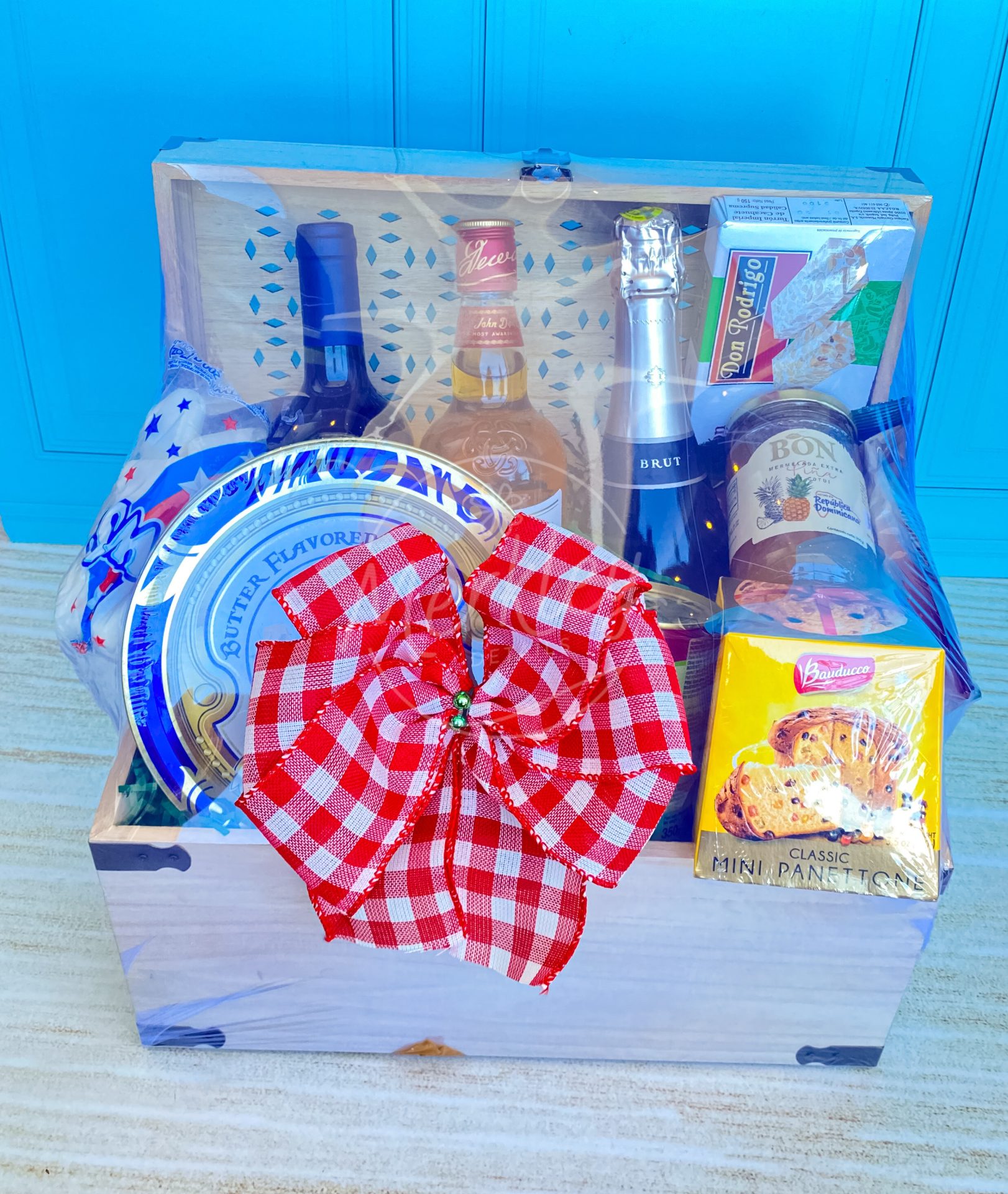 Baúl, Dewar’s, vino tinto, espumoso, conserva de frutas, galletas danesas, panettone, turrón, marshmallows.