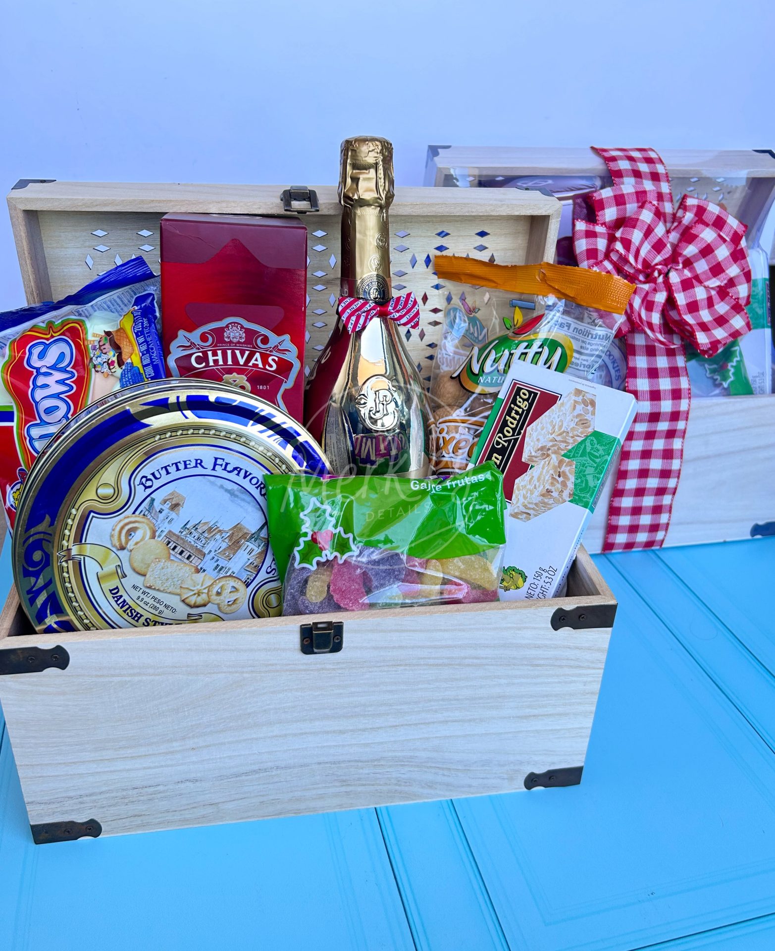 Baúl con JP Chenet dorada, dulces, galletas danesas, marshmallows, Chivas 12 años, turrón y coquitos.