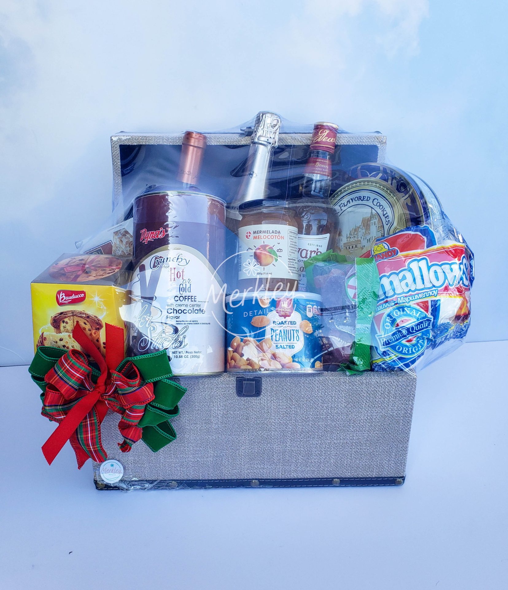 Espumoso o sidra, vino tinto Loma Negra, Dewar’s, panettone, wafer rolls, marshmallows, galletas danesas y baúl.