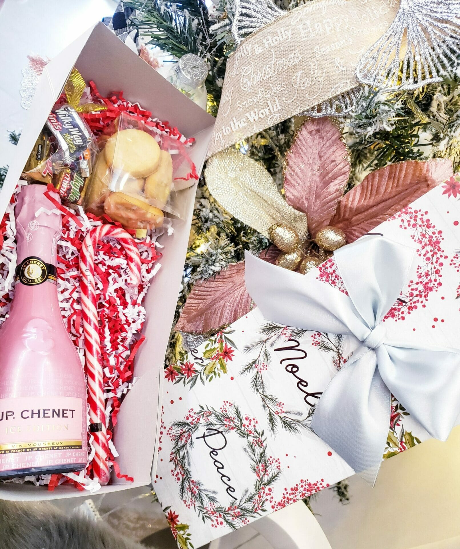 Mini sidra o espumoso, bastón de caramelo, galletas navideñas y dulces mixtos en cajita navideña.