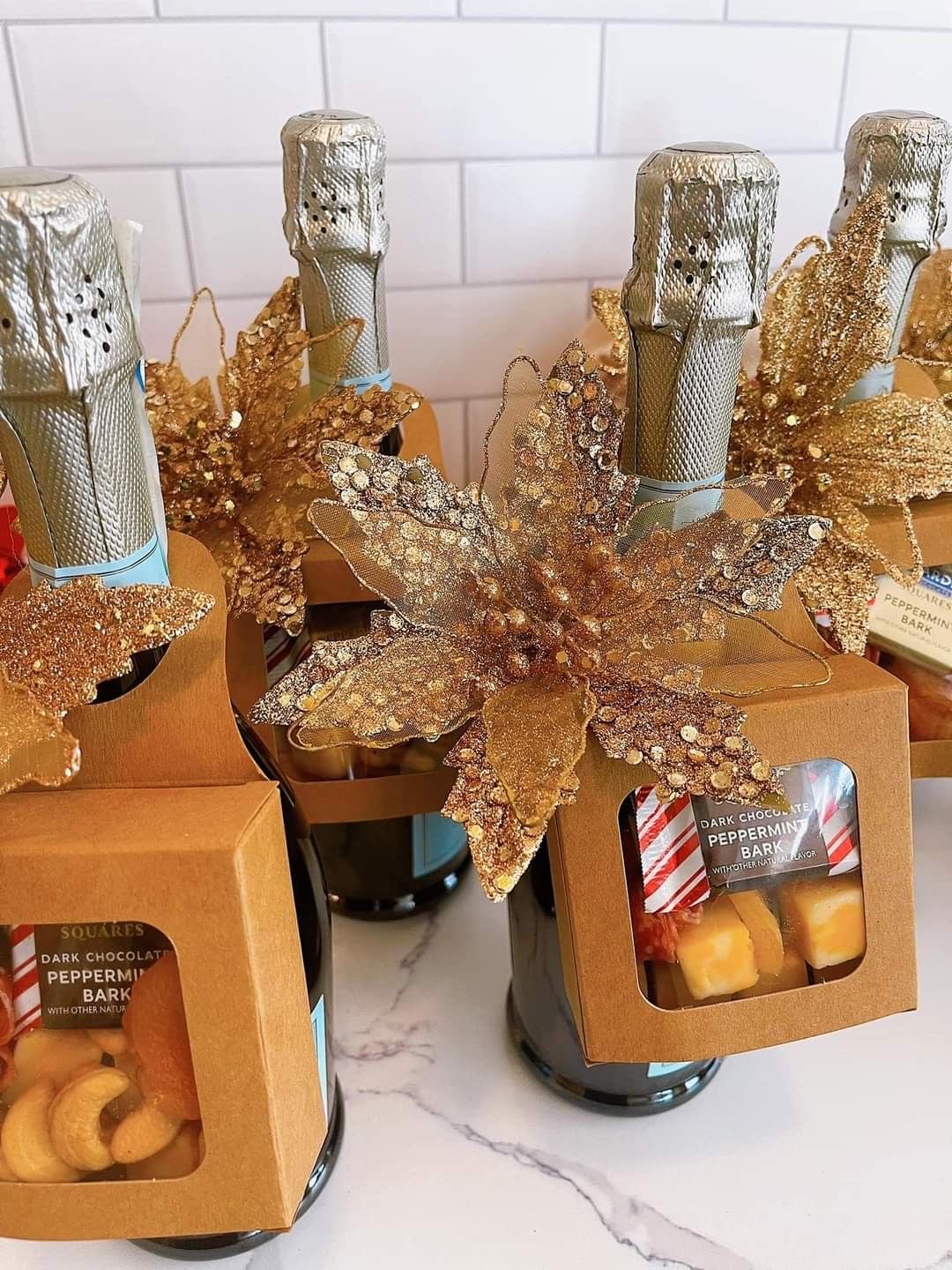 Vino o espumoso con cajita rellena de picadera fría y chocolates.
