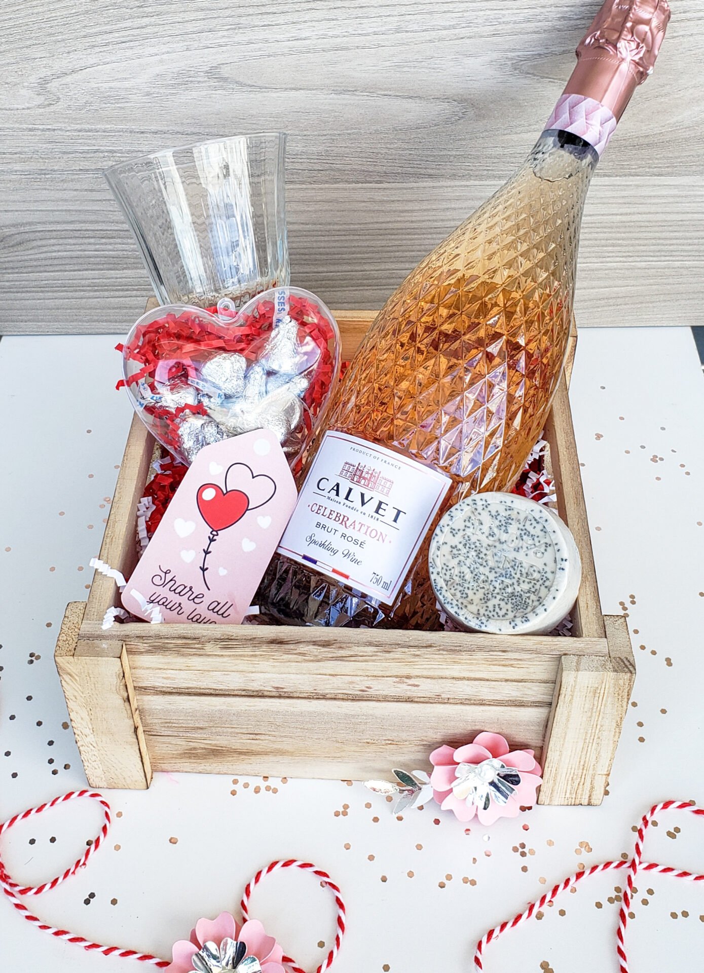 Caja con vino rosado, copa personalizada y chocolates kisses.