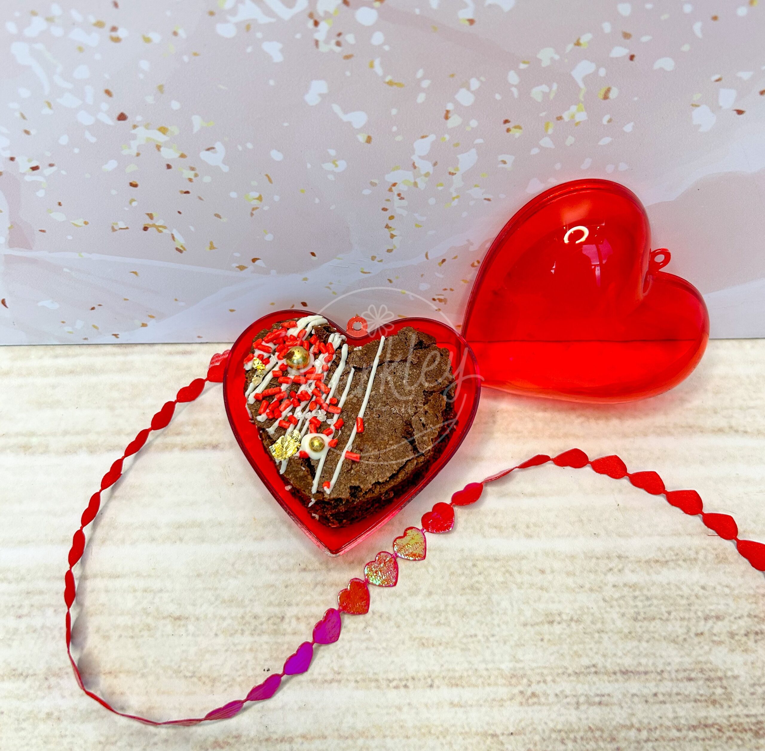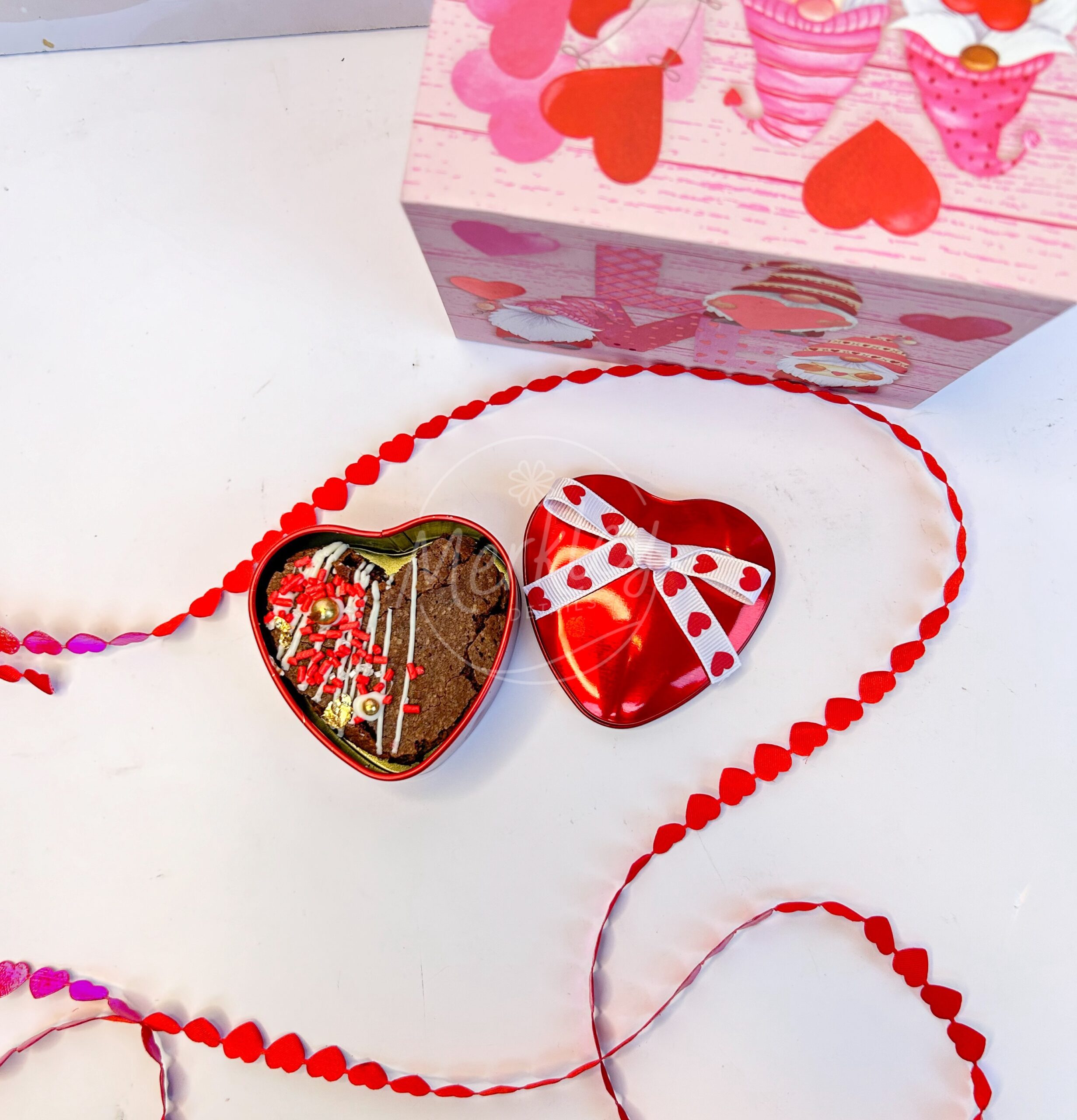 Cajita corazón de metal con brownie decorado en forma de corazón