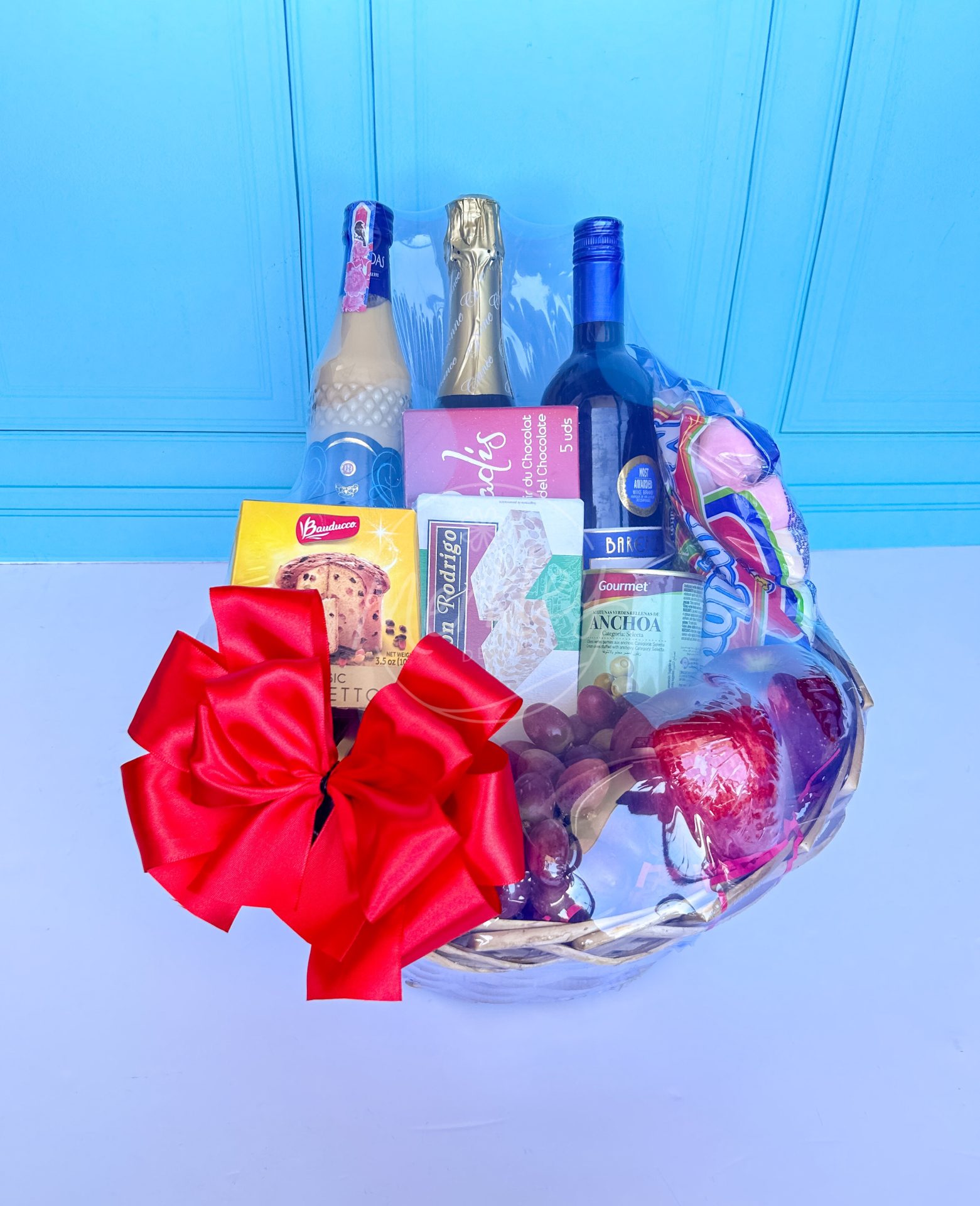 Canasta, ponche, vino Loma Negra y espumoso, manzanas, uvas, panettone, turrón, marshmallows y aceitunas rellenas.