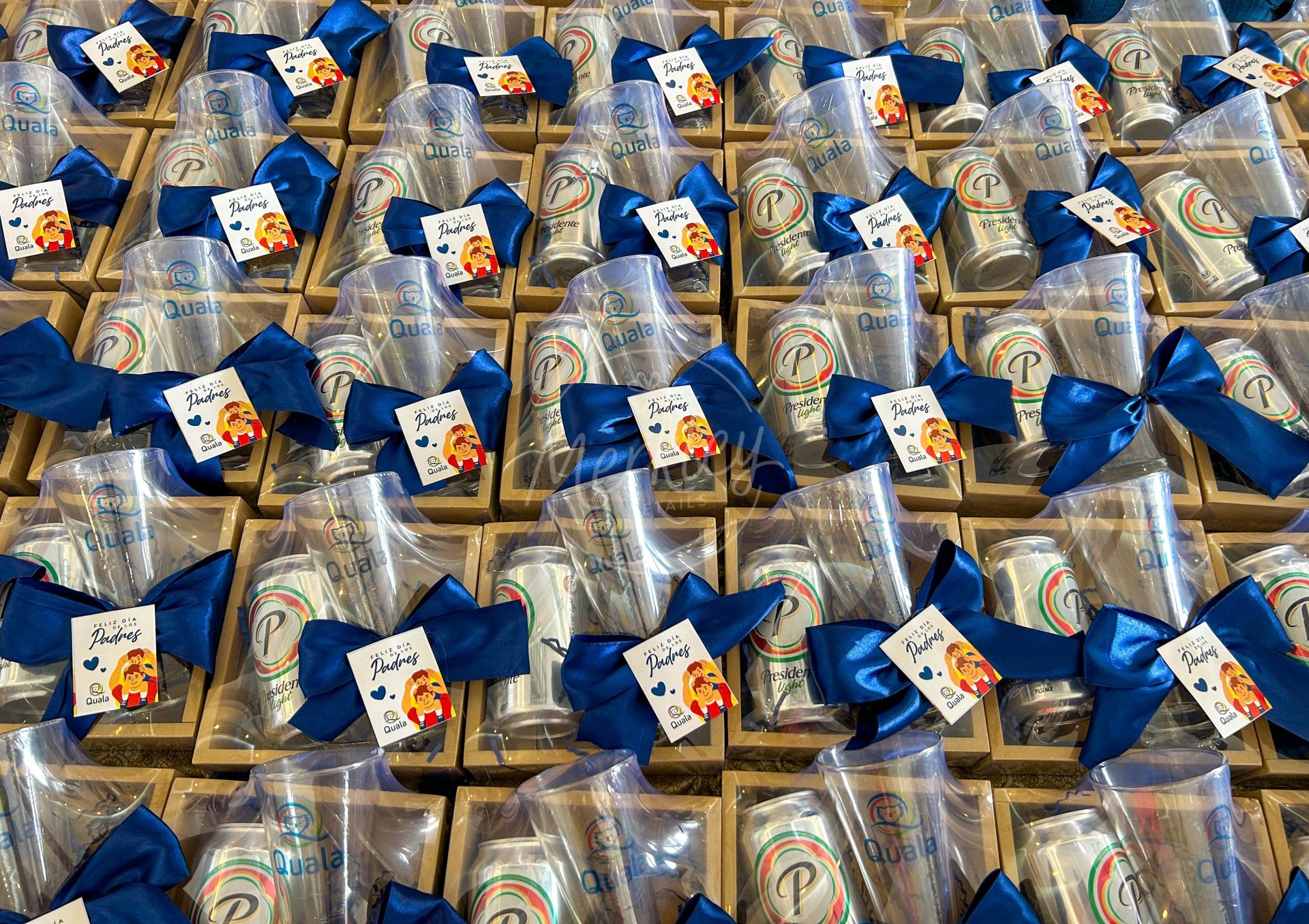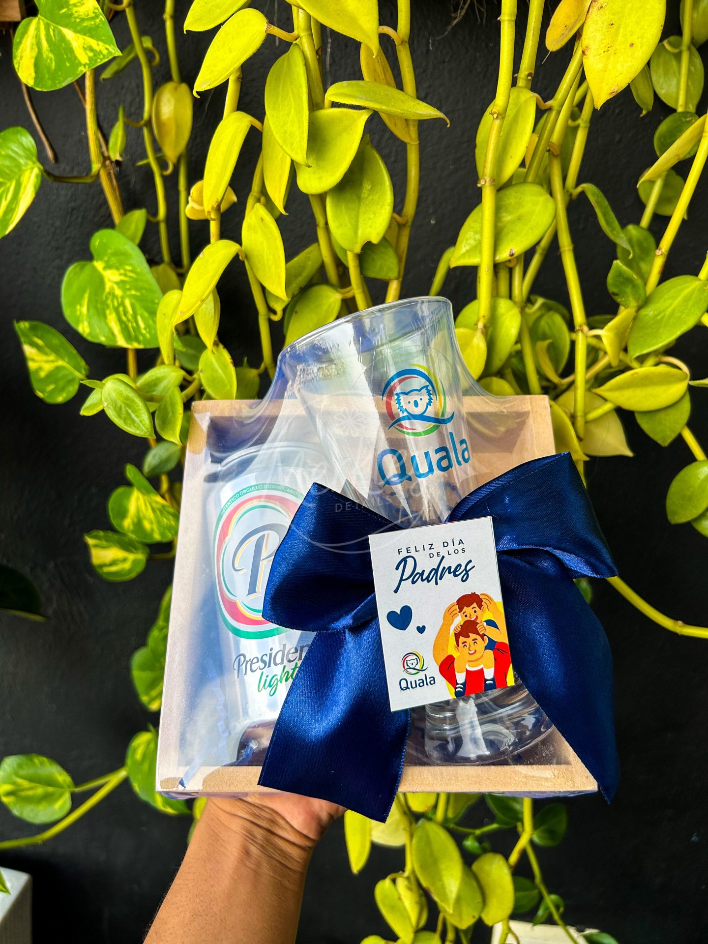 Cesta de madera con cerveza y jarra cervecera decoradas.
